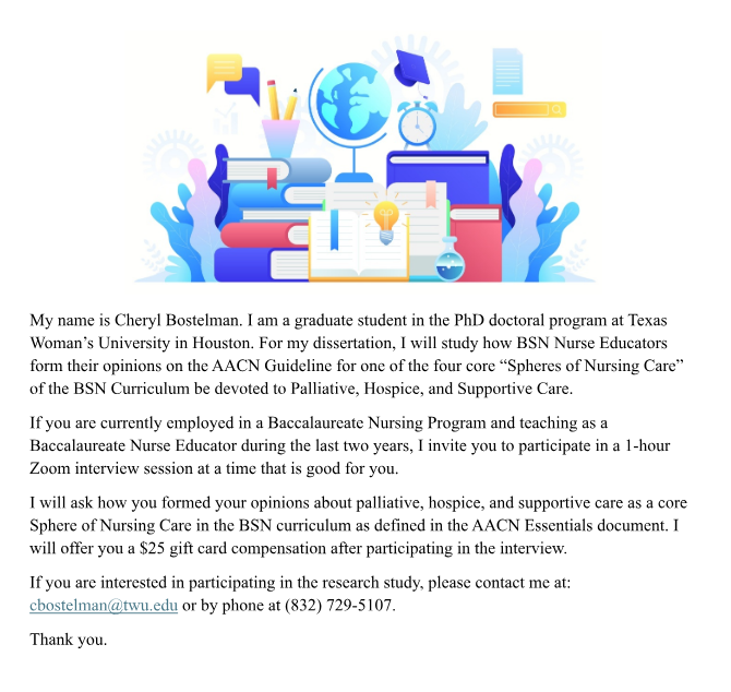 We are pleased to share the following message from Cheryl Bostelman, a graduate student in the PhD doctoral program at Texas Woman’s University in Houston. Cheryl is seeking participants for her dissertation study and has asked us to share this opportunity with our membership.